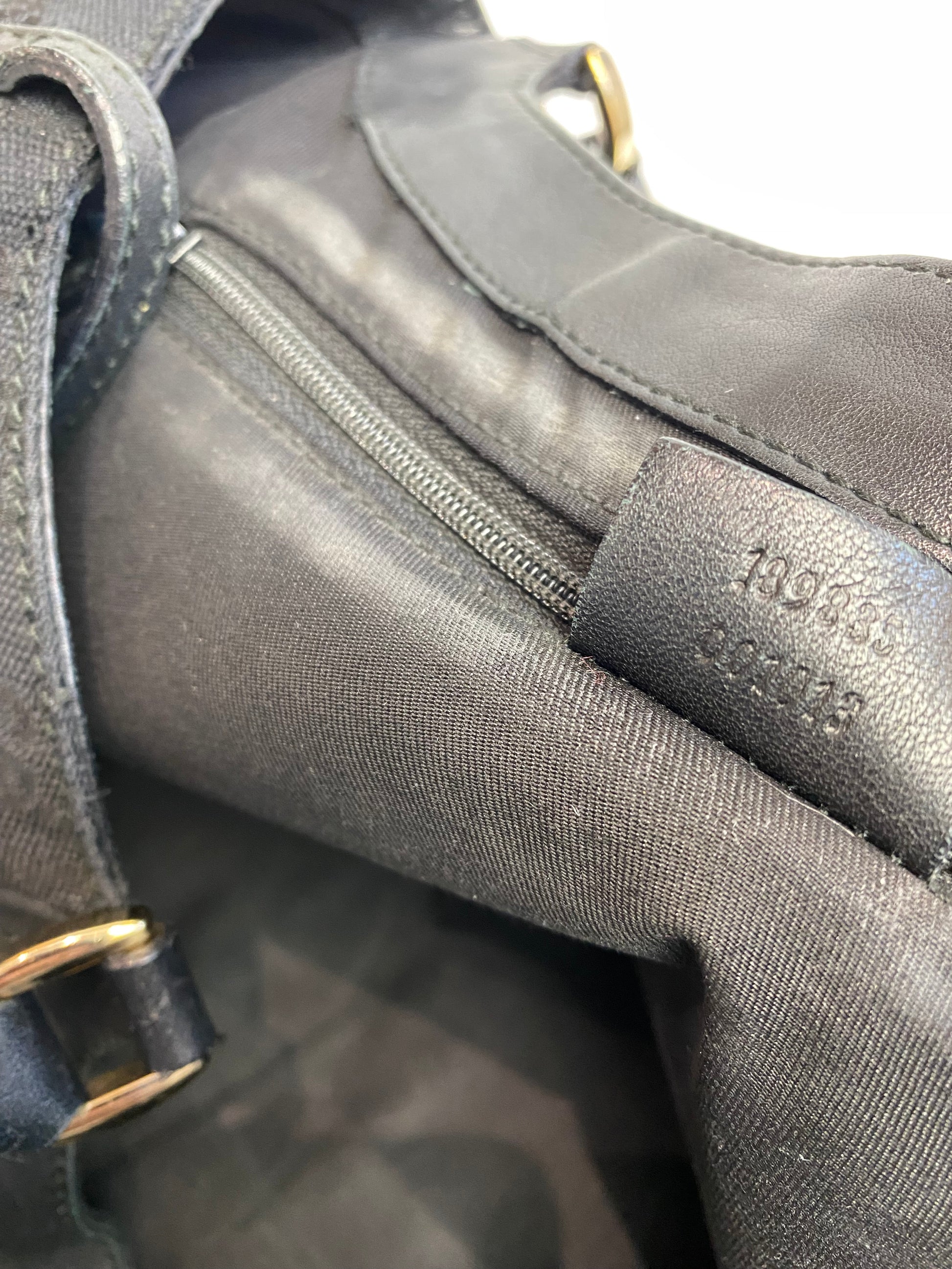 Black monogram canvas exterior with gold hardware featuring the D ring detail to front, black leather handle and piping. Open top compartment with single clasp closure and inside small compartment zip. Spacious bag with enough room to fit a laptop - perfect for everyday use.