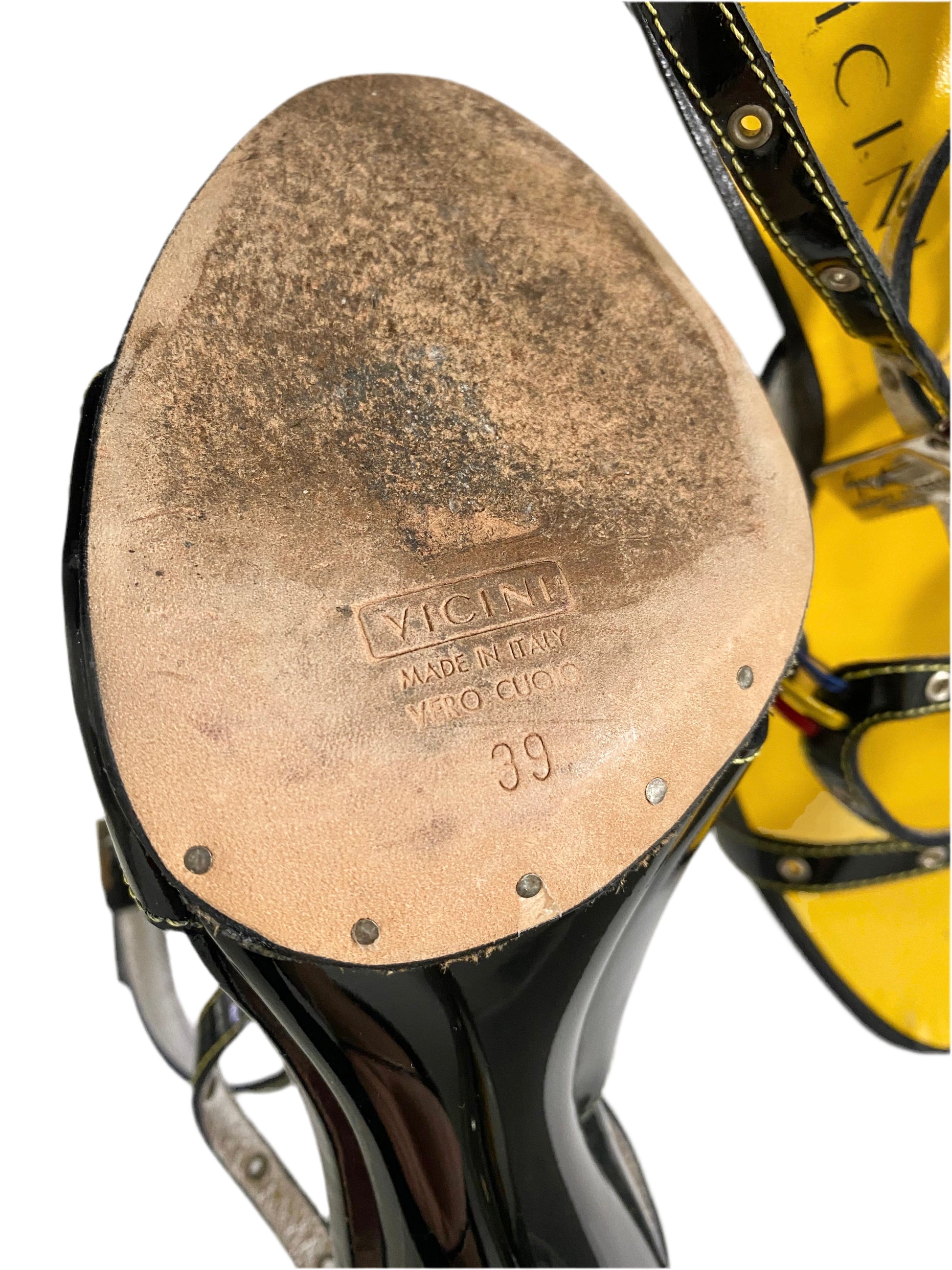 These Rare Giuseppe Zanotti Vicini Vintage heels feature a black patent leather exterior with a yellow sole, eyelet and contrast stitched wrap leg strap, red yellow and blue accents and a silver charm on either heel. Complete with a silver metallic stiletto heel. Perfect statement heels to complement any outfit